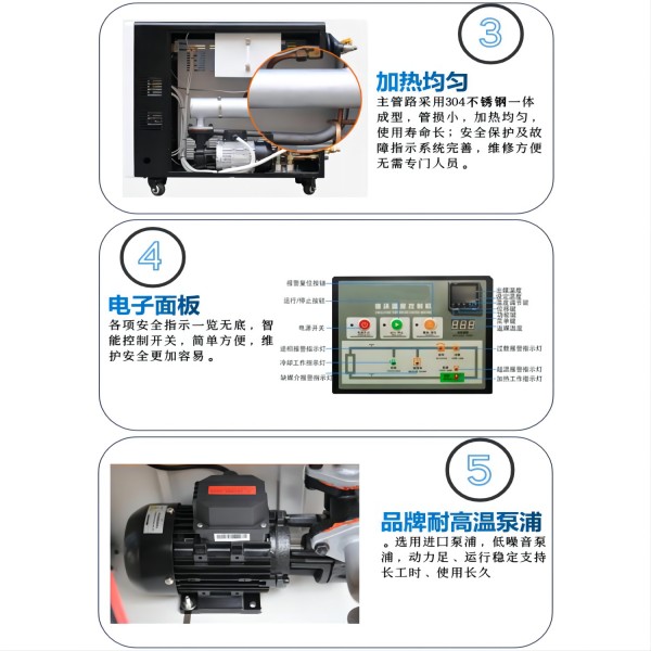 1.傳熱泵浦:采用臺灣元新系列高溫泵浦,運(yùn)行快準(zhǔn),傳熱效果明顯,噪音低,無滲漏.